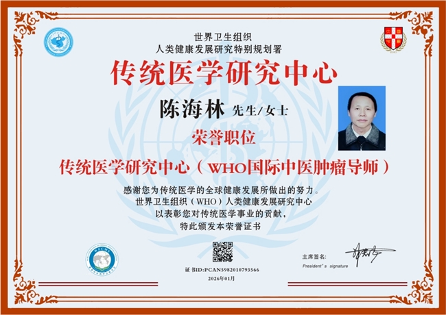 从基因测序仪下的科学验证,到山村患者田间劳作的鲜活场景;从国际展会的金奖证书,到WHO官员的高度评价,陈海林教授用五十年坚守证明:当东方智慧与西方科技真正交融,人类终将跨越癌症的鸿沟。这不仅是一位医者的传奇,更是中医药走向世界的时代强音,为全球癌症患者书写着“无瘤新生”的东方答案。